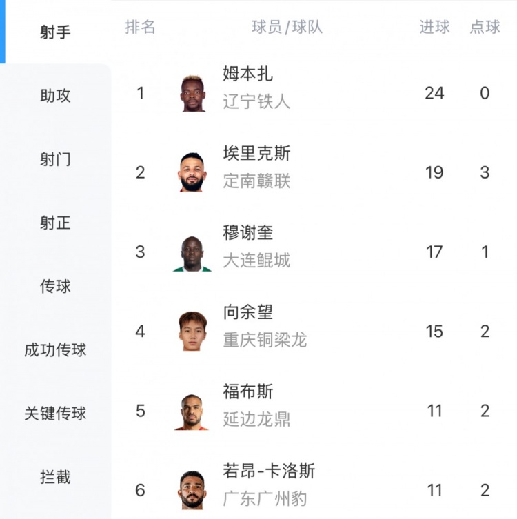 10月6日讯 中甲职业联赛 25轮战罢,射手榜方面,苏超在线直播高清视频无插件本轮双响的姆本扎24球领跑,本轮分别得分 的埃里克斯和向余望分居第二和第四位。