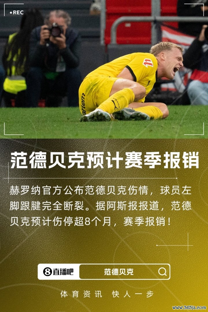 9月26日讯 赫罗纳官方宣布范德贝克伤情,范德贝克左脚跟腱完全断裂.《阿斯报》报道,赫罗纳中场球员范德贝克预计将伤停超8个月,本赛季报销。