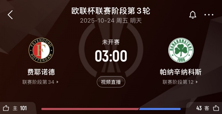 10月23日讯 官方消息,原定北京时间今晚22点30分进行的欧联杯,苏超直播在线观看费耶诺德主场作战 vs帕纳辛纳科斯的赛事 因天气原因推迟。
