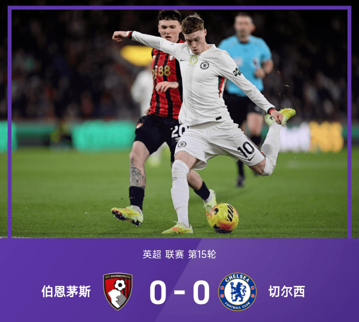 25/26赛季英超职业联赛 第15轮,伯恩茅斯0-0互交白卷闷平切尔西。上半场开场塞梅尼奥闪击破门,但VAR显示埃瓦尼尔森越位违例 在先,得分 无效。下半场加纳乔顶球中柱,双方均无建树。最终,切尔西客场应战 0-0闷平伯恩茅斯。切尔西没有抓住扩大领跑 积分优势,切尔西最近赛事 竞技状态 起伏不定,球队表现不稳定。