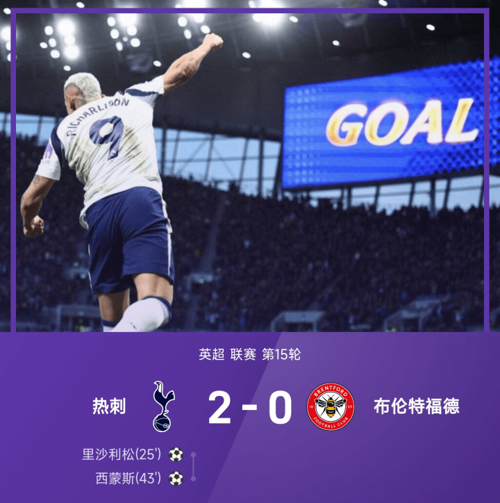第25分钟,热刺右路长传,西蒙斯插上突入危险区域 横传门前,里沙利松插上抢点破门!热刺1-0布伦特福德,第43分钟,西蒙斯前场抄截 直接一条龙突入危险区域 ,面对包夹封堵低射破门!热刺2-0布伦特福德,上半场热刺取得2-0领跑 ,下半场双方易边再战,双方在下半场没有得分 ,全全场赛事 结束热刺2-0战胜小蜜蜂,