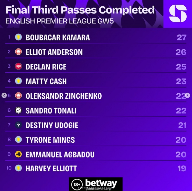 9月24日讯 英超第5轮战罢,squawkafootball列各项数据排行,苏超直播维拉中场球员布巴卡尔-卡马拉是在攻击 三区完成传送球 最多的球员,共27次。
