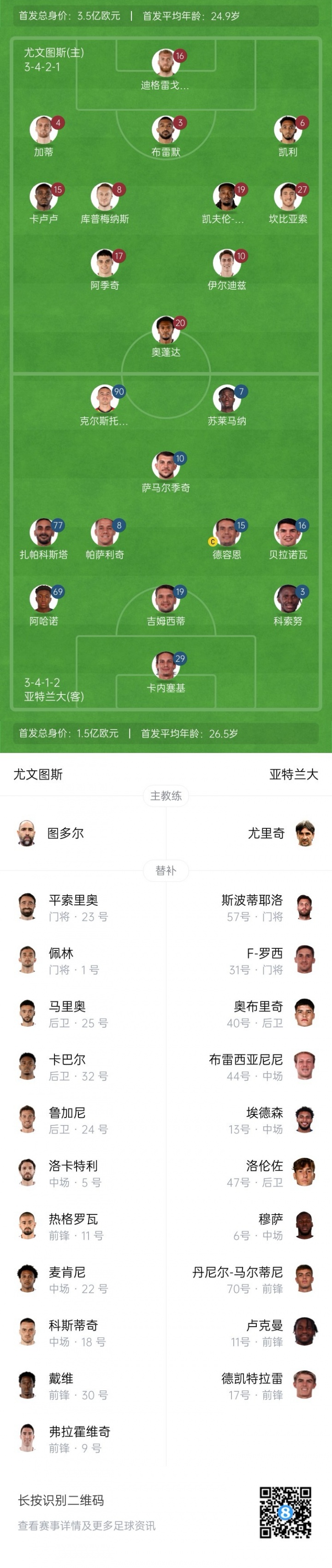 尤文杆位:16-迪格雷戈里奥、3-布雷默、4-加蒂、6-凯利、15-卡卢卢、27-坎比亚索、8-库普梅纳斯、17-阿季奇、19-凯夫伦·图拉姆、10-伊尔迪兹、20-奥蓬达