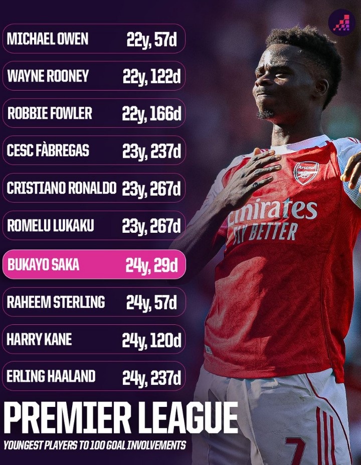 以下为英超历史达成直接加入 100球最年轻记录 榜,萨卡位列第7。