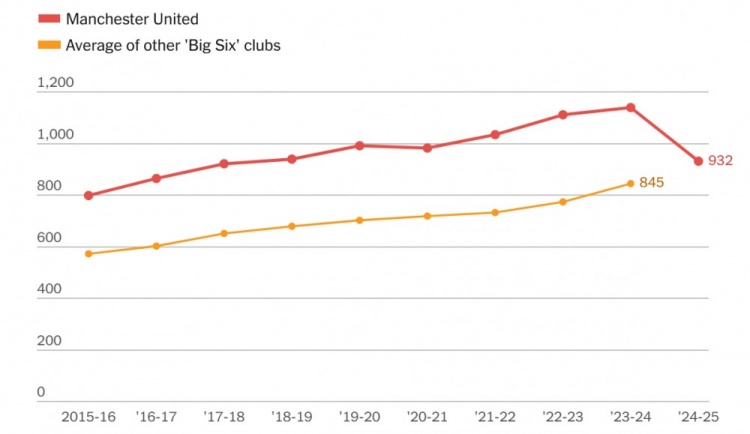 拉特克利夫削减成本的举措在员工数量上体现得最为明显。2024年2月以来的公告表明,曼联总计可能有多达450名全职员工离职,而2024-25赛季的员工总数已较上年同期减少208人。鉴于这是平均值且裁员计划在整个赛季持续进行,预计2025-26赛季将进一步下降。