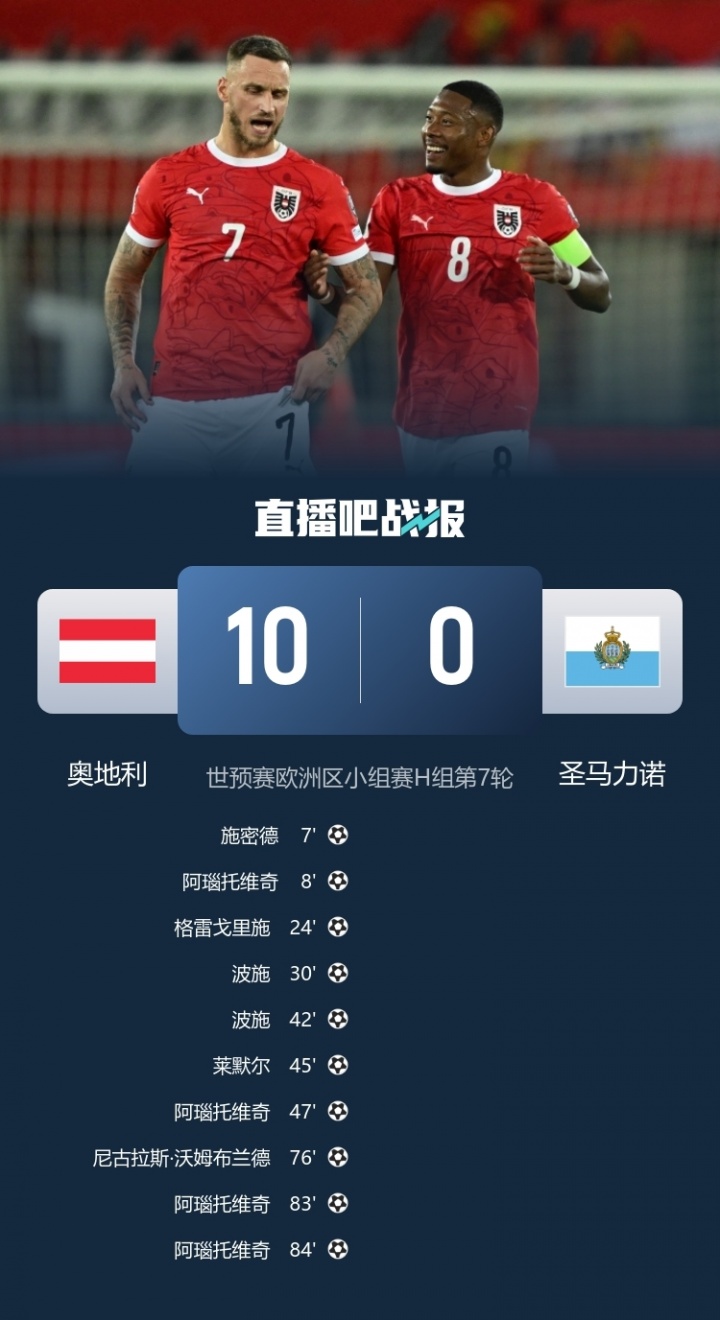 奥地利10-0狂胜圣马力诺,阿瑙托维奇大四喜。奥地利5连胜领跑H组;圣马力诺6连败、只进1球狂丢28球,排名倒数第一。