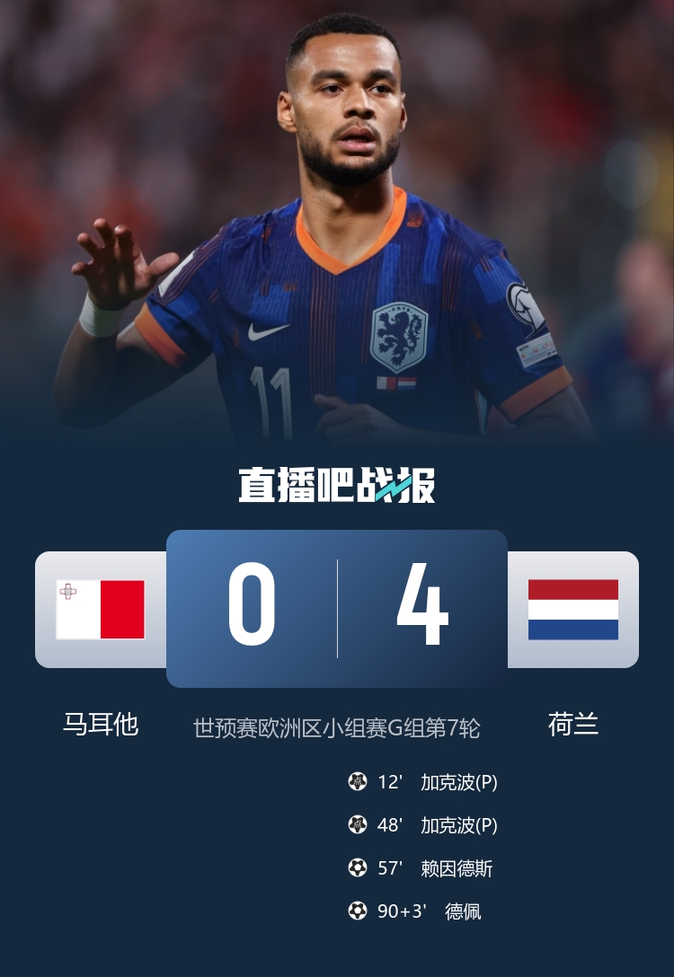 上半场赫拉芬贝赫造点,加克波点射闪击得手,下半场加克波点射完成双响,赖因德斯推射扩大比分,德佩后备 建功,最终荷兰4-0马耳他三分领跑。