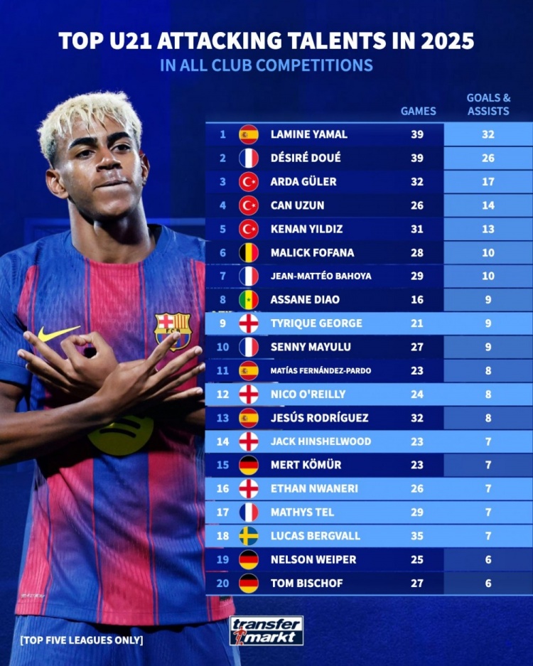 10月11日讯 德国转会市场列出了2025年五大职业联赛 U21球员加入 得分 榜,亚马尔32球居首,苏超在线直播高清视频无插件杜埃26球次席。