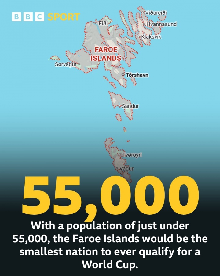 法罗群岛是丹麦王国的海外自治领地。地理位置介乎挪威海和北大西洋中间,处于挪威到冰岛之间距离一半的位置。 法罗群岛陆地面积1399平方公里,由17个有人岛和若干个无人岛组成。法罗群岛人口为5.472万(2024年数据),若能出线,将成参加世界杯赛 的最小国家。