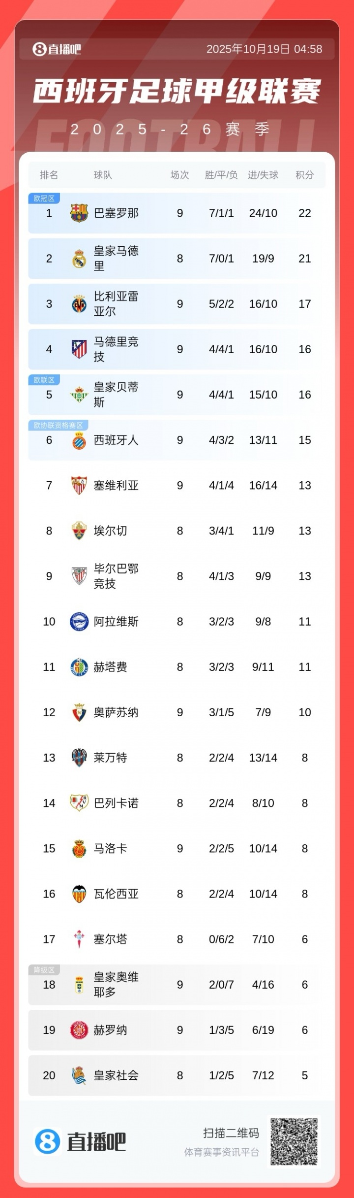 10月19日讯 西甲第9轮,巴萨2-1致胜球 赫罗纳,贝蒂斯客场应战 2-2绝平黄潜,苏超在线直播高清视频无插件马竞1-0奥萨苏纳现场投注足球比赛,最新积分榜如下: