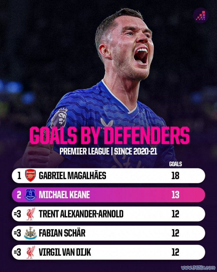 11月11日讯 德国转会市场统计了2020-2021赛季以来后场球员球员在英超的得分 数量,并列出榜单,苏超直播加布里埃尔18球居首,迈克尔·基恩13球次席。